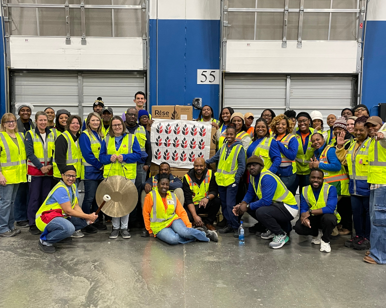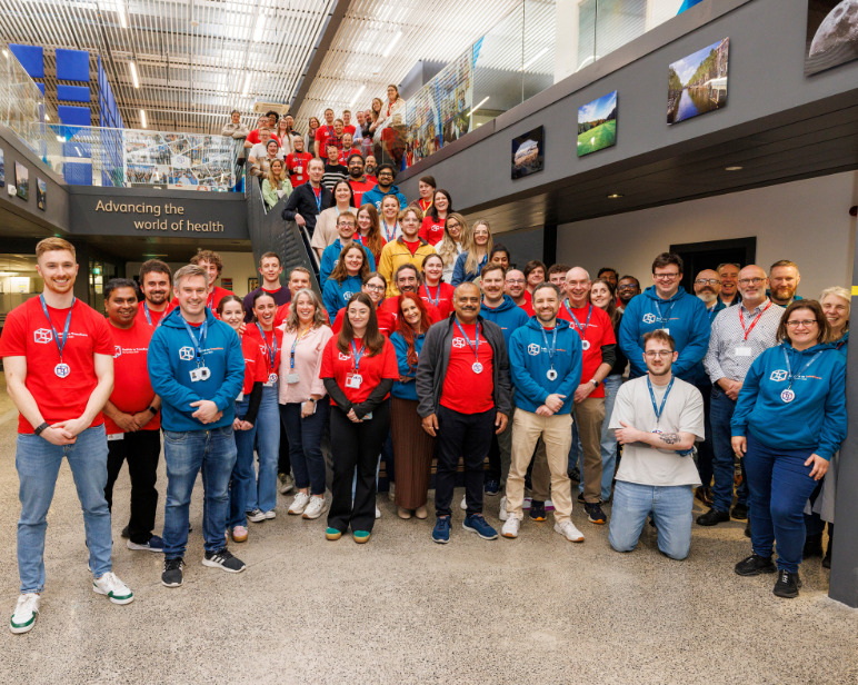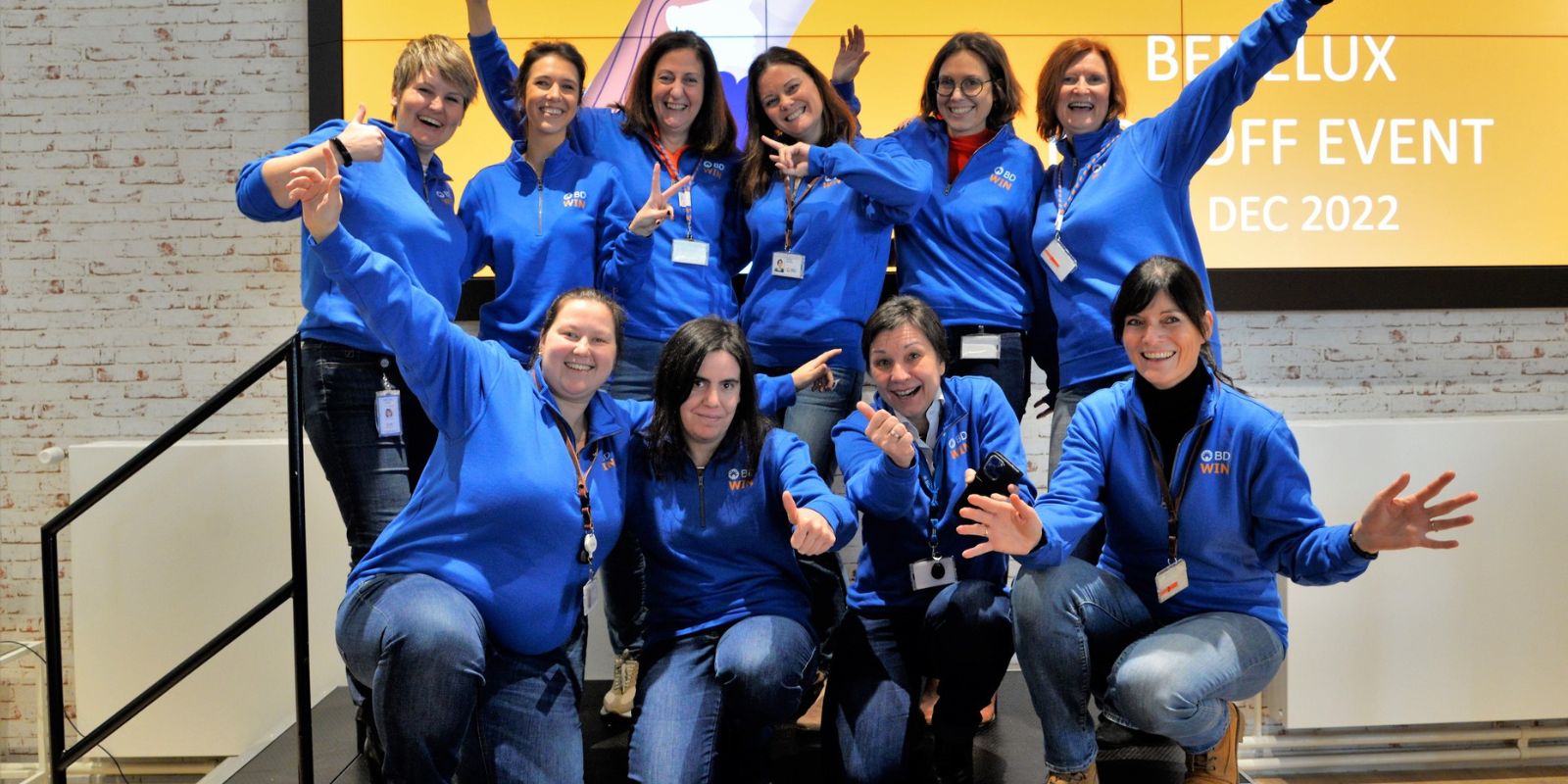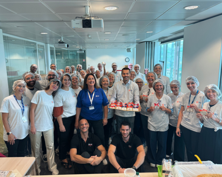 • Outdoor photo of lots of BD associates all cheering together in front of a sign which reads 'Patients'.